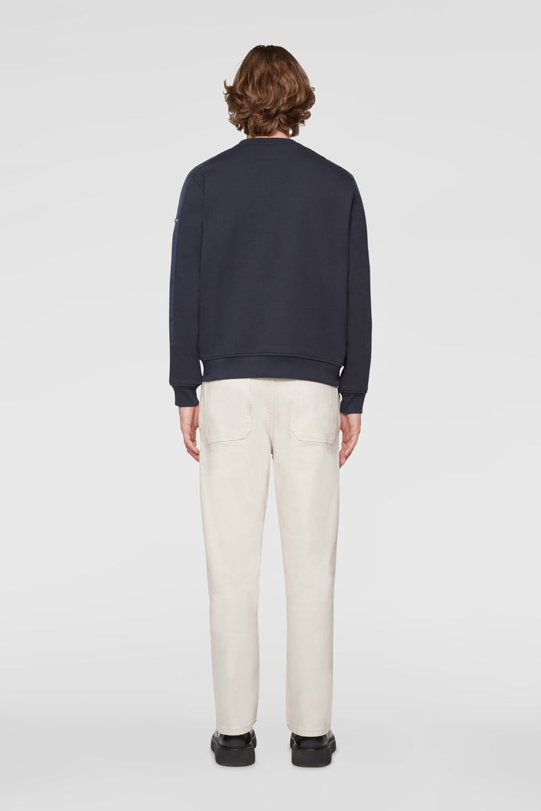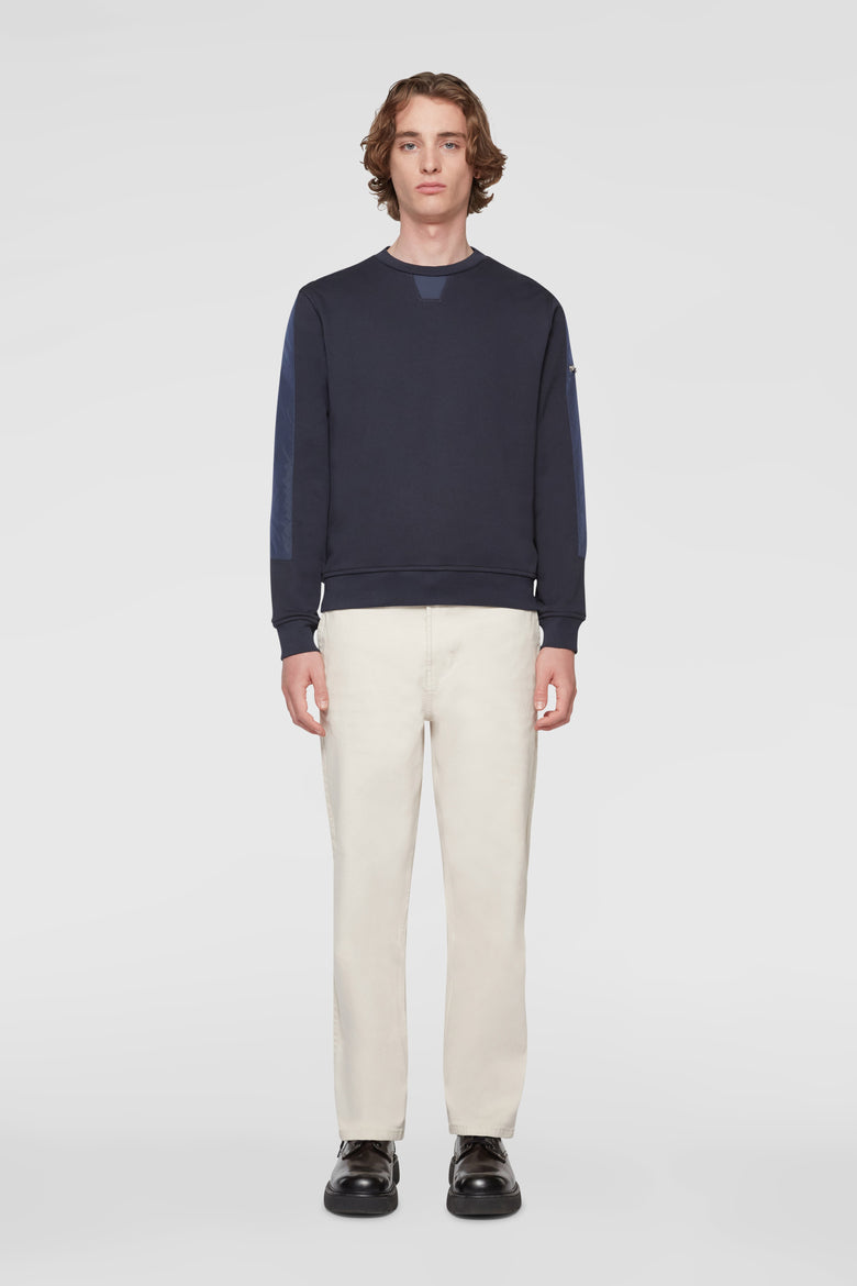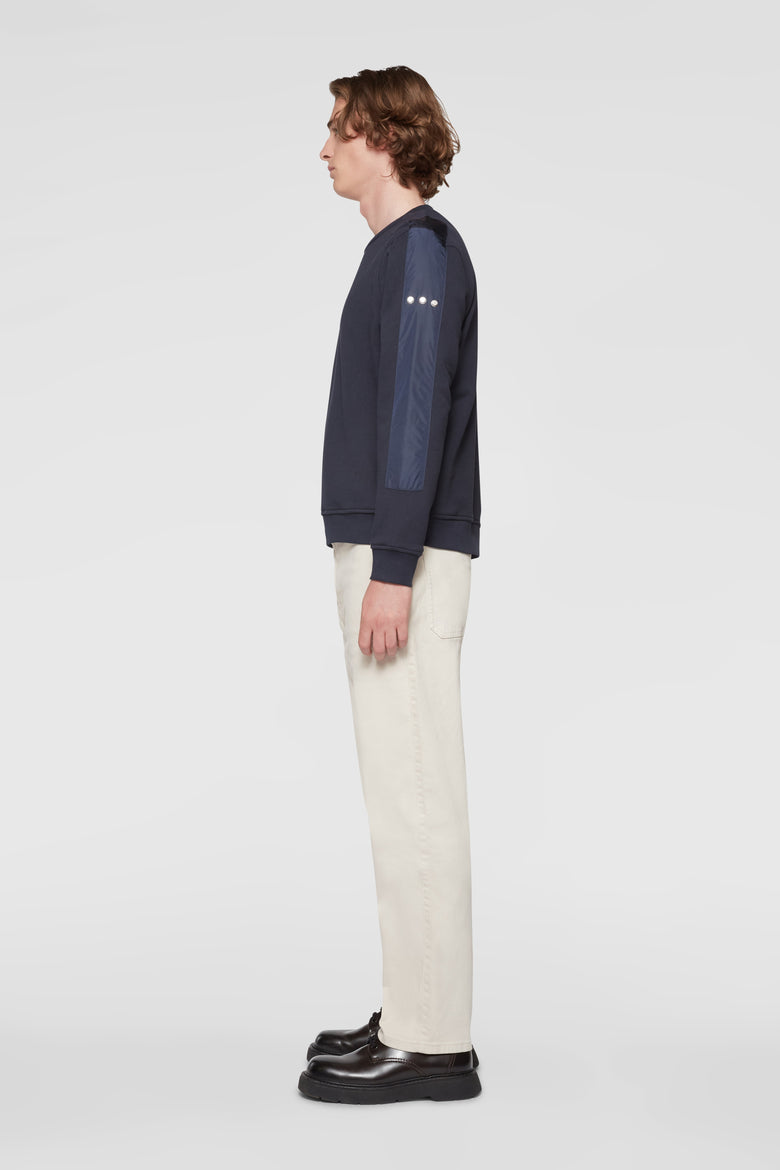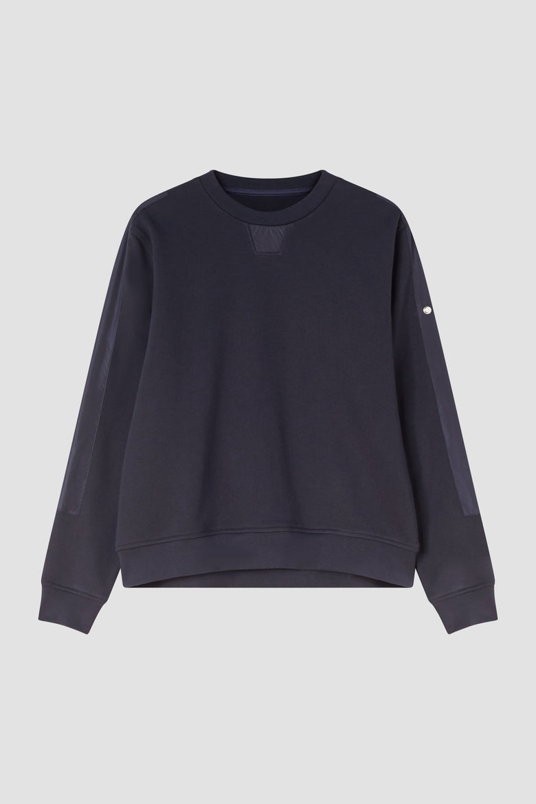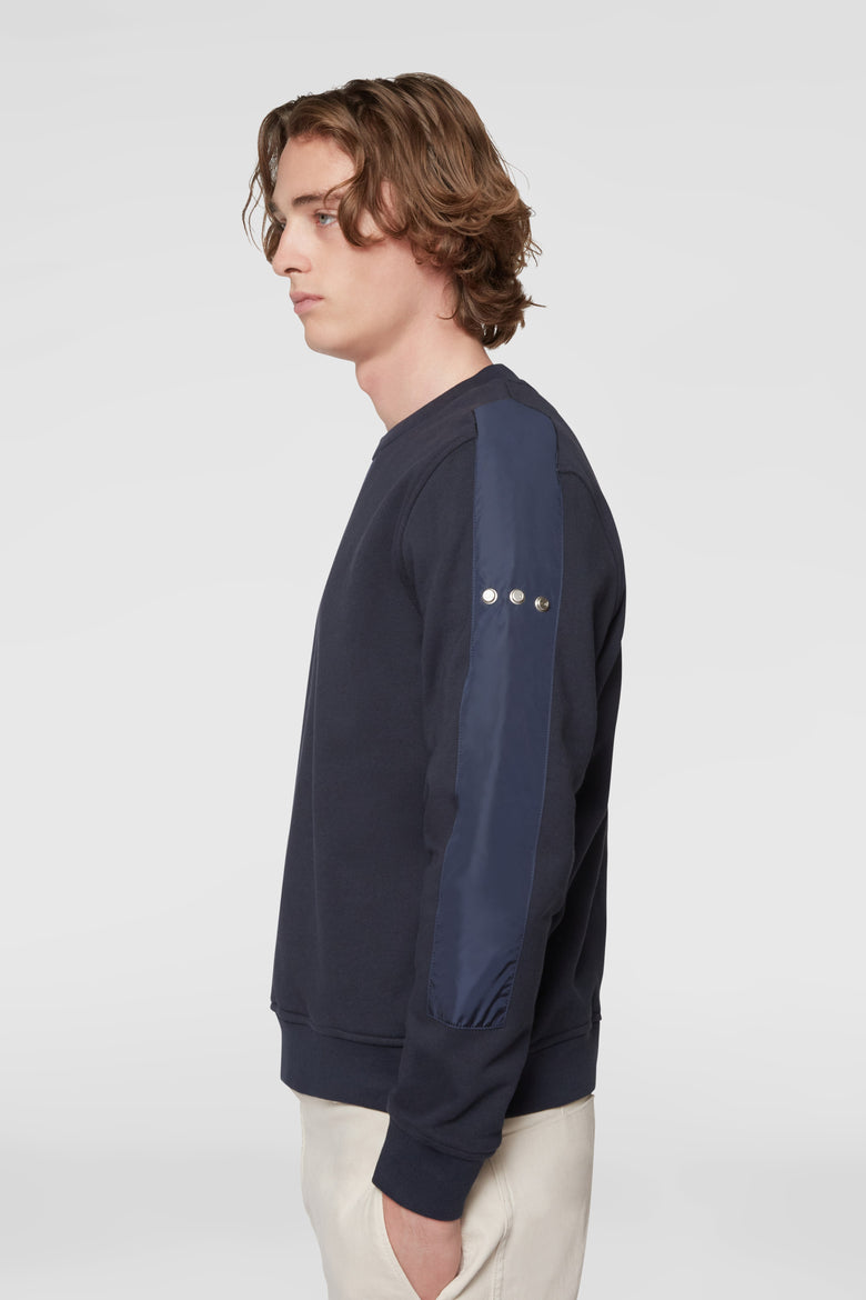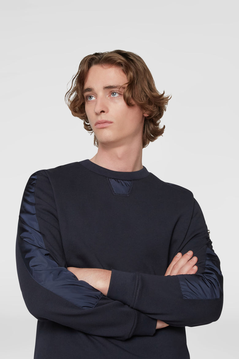 • Scollatura rotonda Dettaglio di applicazione nylon tono su tono con impunture zig-zag su fronte scollo Contrasti in nylon tono su tono applicati su bordo manica Costina su polso e fondo capo Metal dots add® manica sinistra