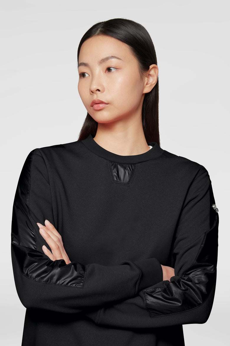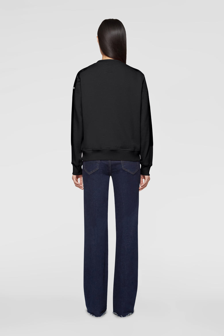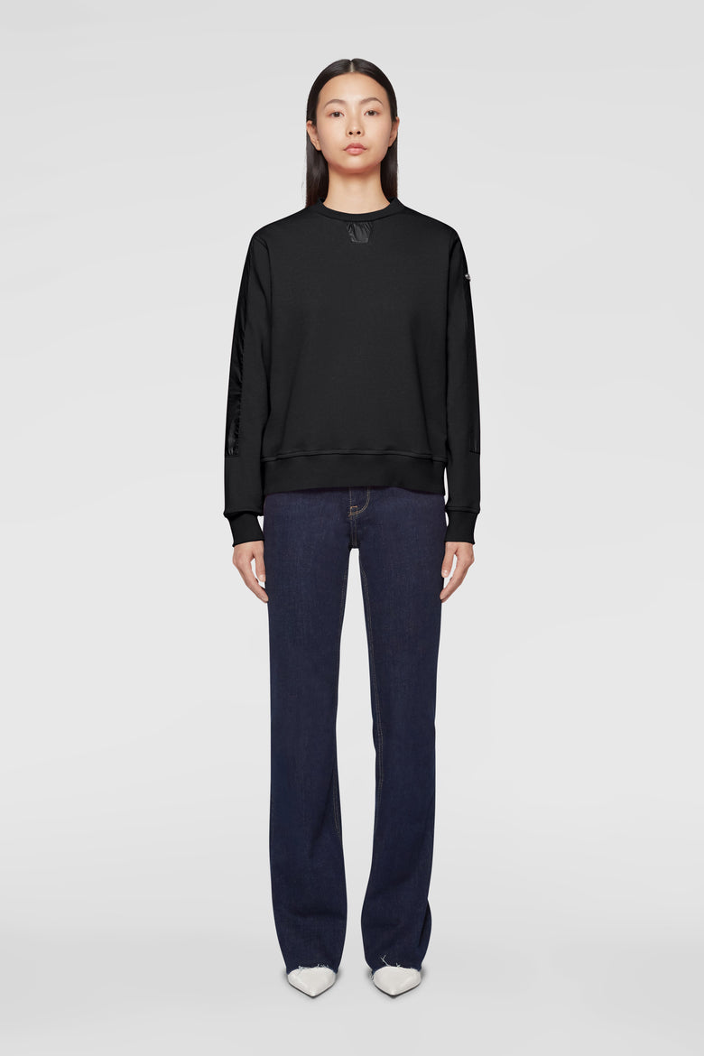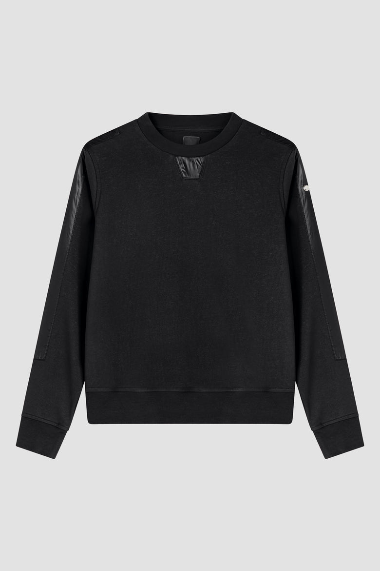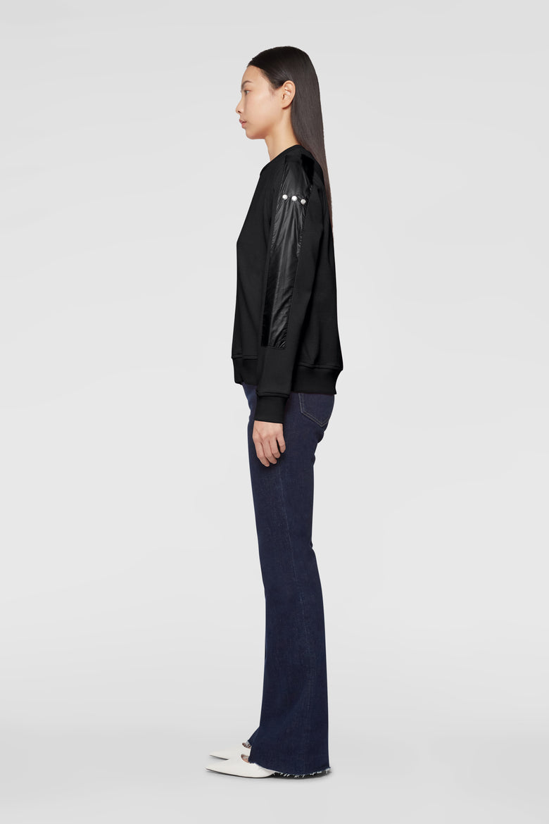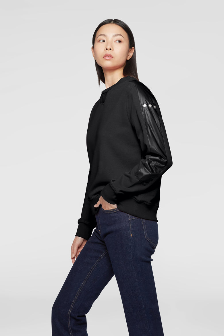 • Scollatura rotonda Dettaglio di applicazione nylon tono su tono con impunture zig-zag su fronte scollo Contrasti in nylon tonosu tono applicati su bordo manicaCostina su polso e fondo capo Metal dots add® su manica sinistraVestibilità regular