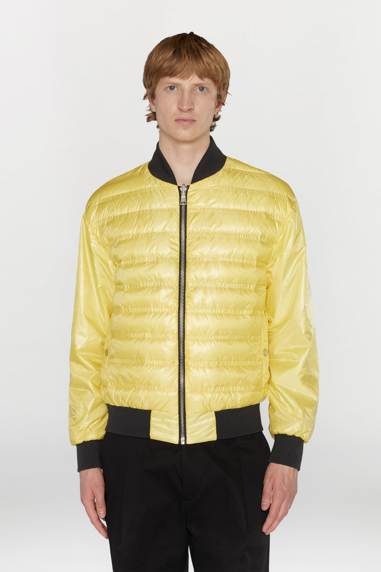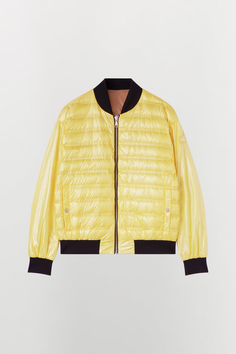 • Lato trapuntato e maniche lisce in nylon lucido. Tasche a profilo con bottone a pressione a scomparsa
