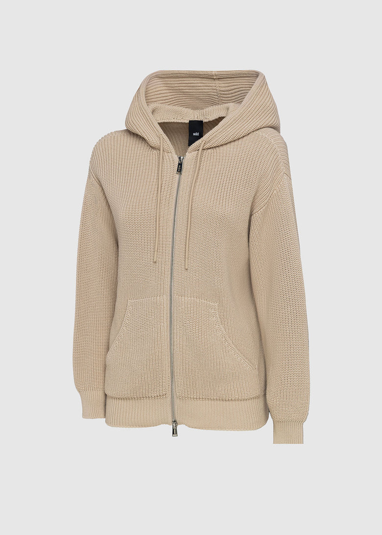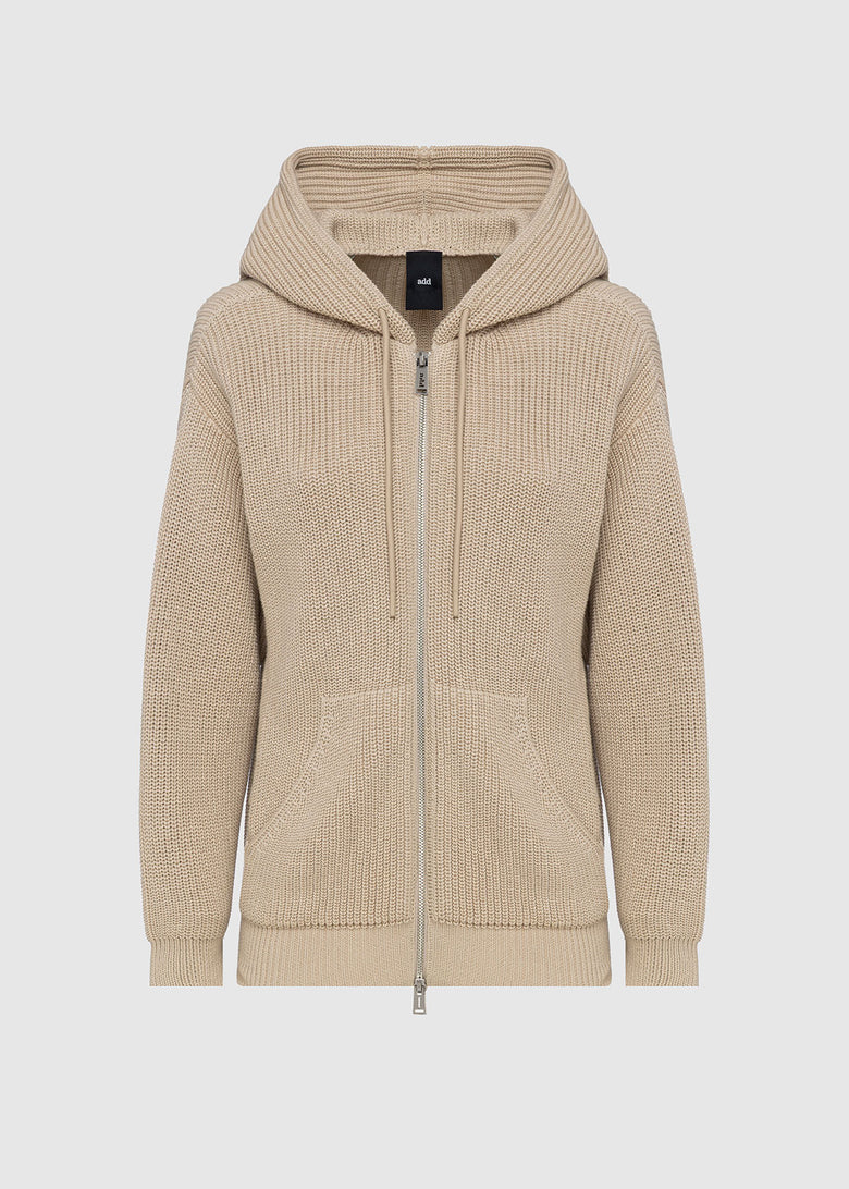 Women's full-zip knit sweatshirt made of 100% cotton, gauge 7 Daily Knitwear fabric with English stitch offering unique softness against the skin. The oversized design features a fixed hood with an adjuster drawstring and an add® zip front closure for a practical and modern look. Long sleeves and dropped shoulders complete the comfortable, relaxed fit. Patch pockets at the front and single rib cuffs add functional and stylish details. Water-washable and breathable, this sweatshirt is perfect for every day.